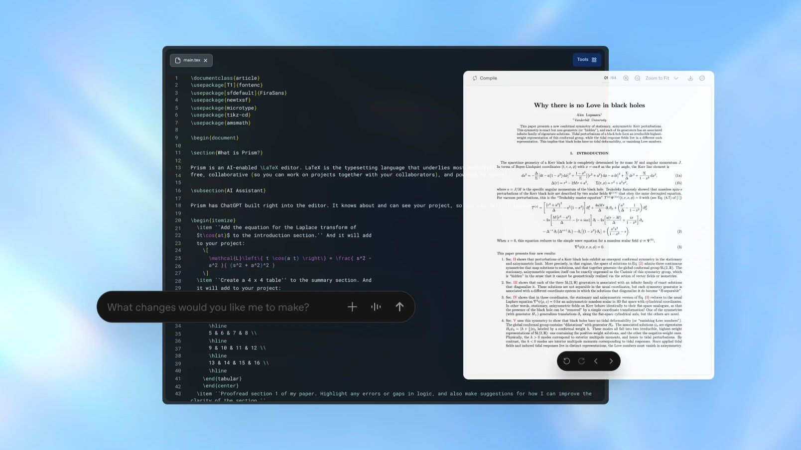 Prism integrates GPT-5.2 directly into the LaTeX-native editor, allowing real-time suggestions, scientific context-awareness, and structured research templates all in one platform.